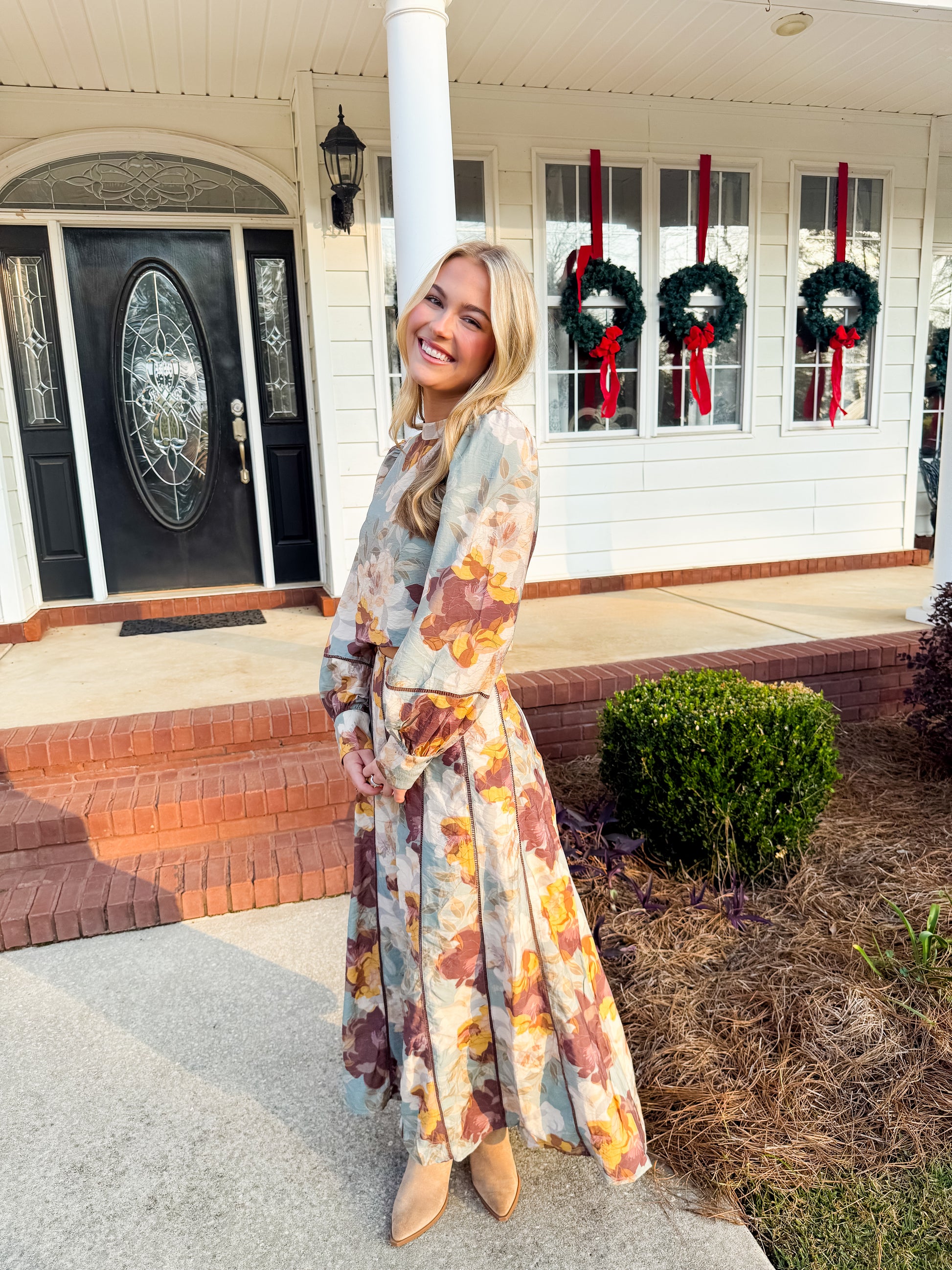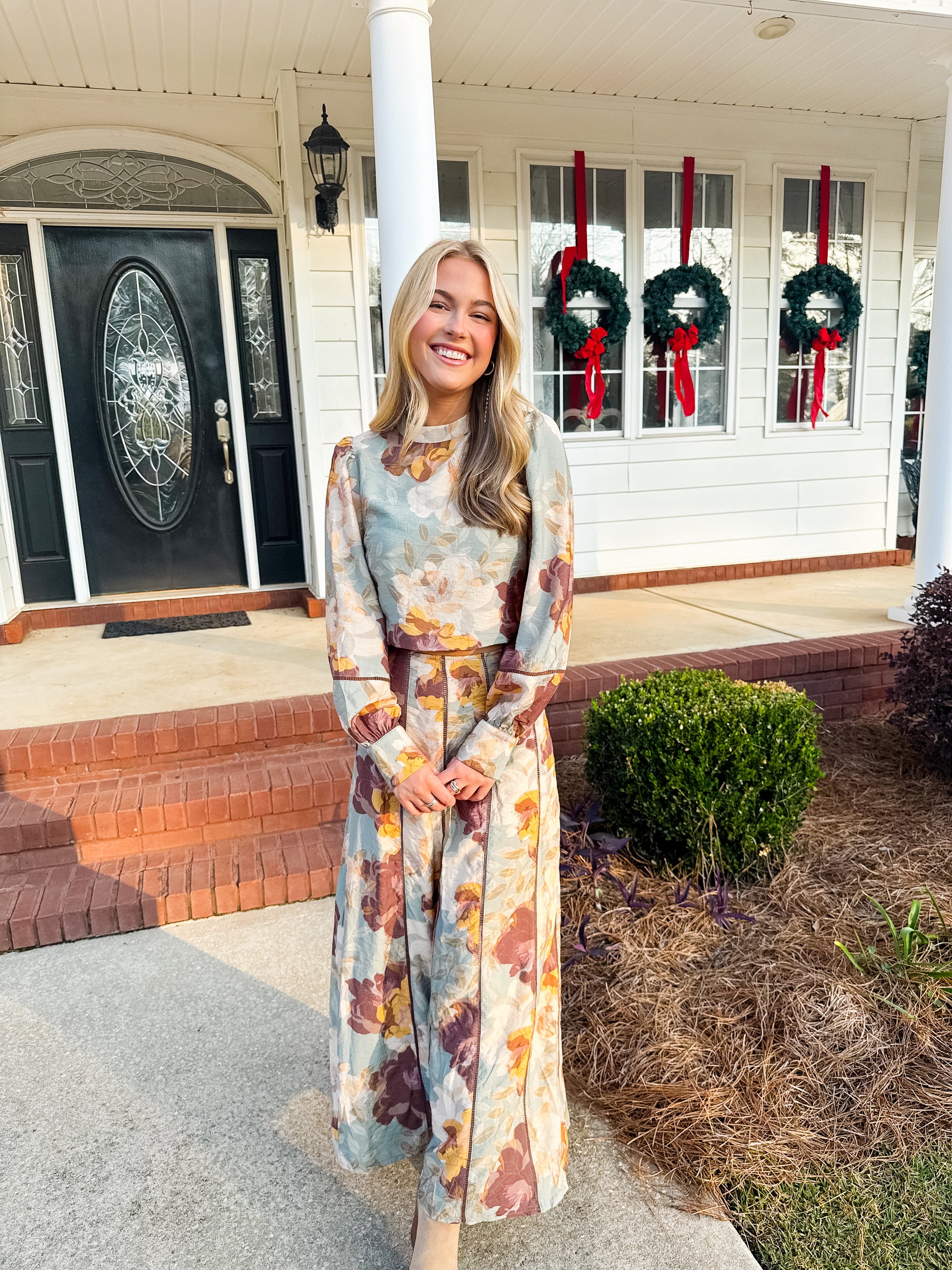 A warm rust-floral co-ord with a sleek fitted top and flowy midi skirt, giving a soft, effortless fall-lux vibe — chic, feminine, and perfect for the season.